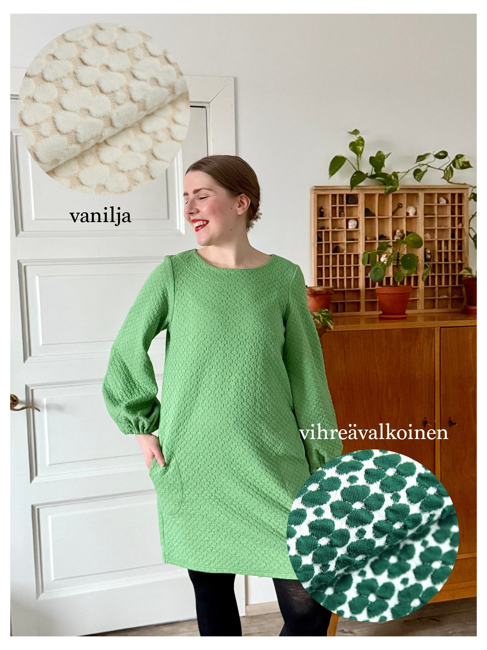 Kevään uutuudesta AAVA puuvillamekosta nyt tilattavissa uusia värejä: pehmeä Apila vanilja sekä Apila vihreävalkoinen. Molemmat tuttua luomupuuvillaista Apila-neulostamme.