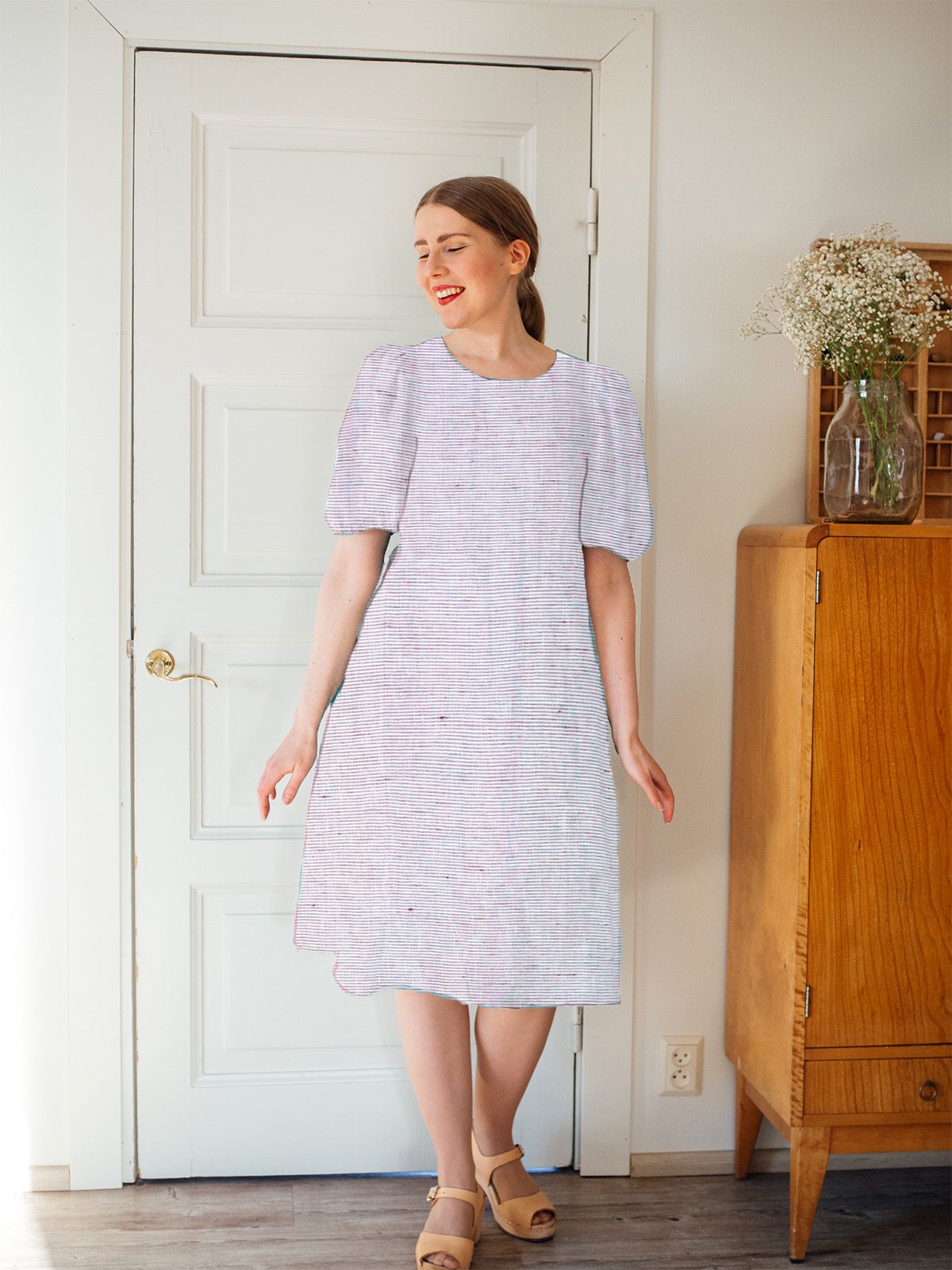 (Tämän mekon koon valinnassa kannattaa painottaa rinnanympäryyttä, mutta verrata myös lantion- ja vyötärönympäryyttä meidän mitoitukseemme. Mikäli ne poikkeavat oleellisesti mittataulukostamme, voit tarkistaa tuotteen mitoista, riittääkö väljyys valitsemassasi koossa myös alaosasta.)