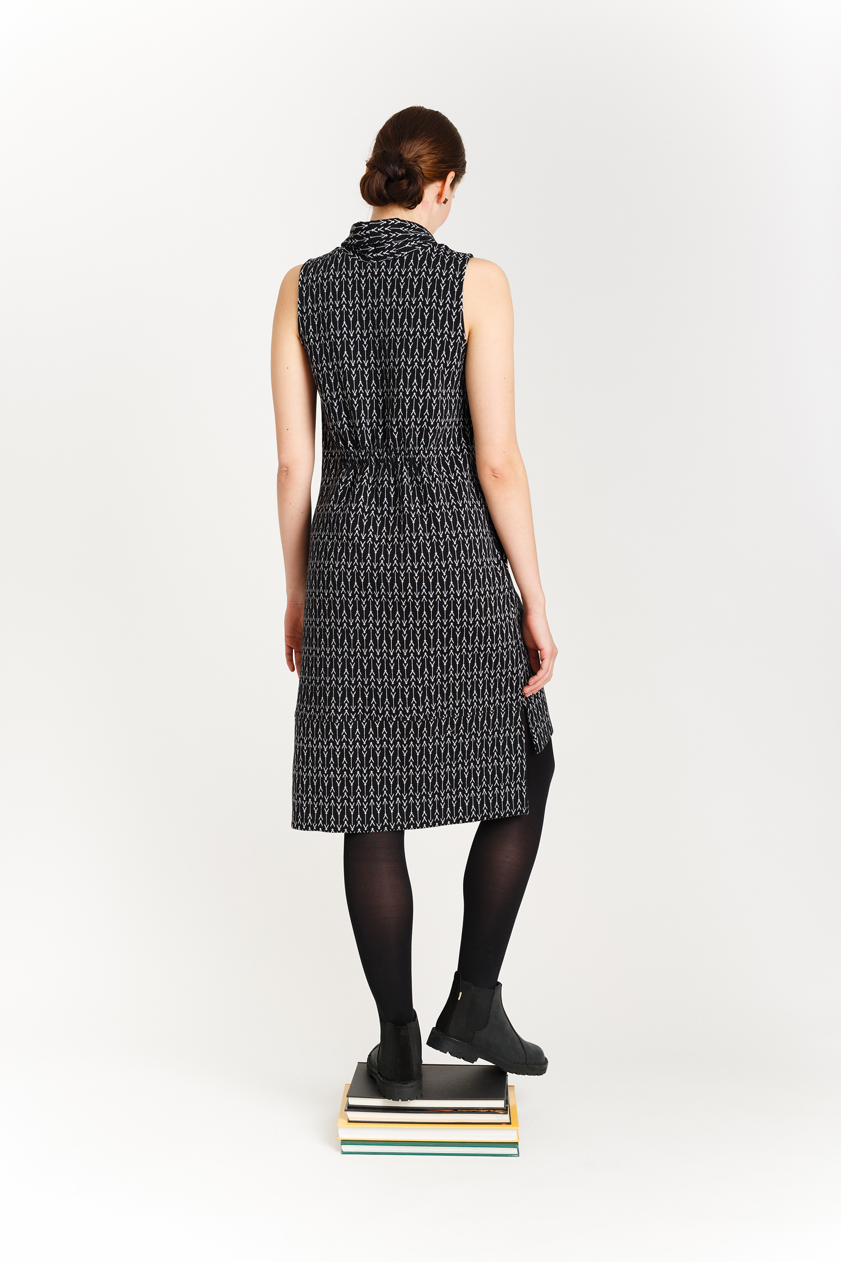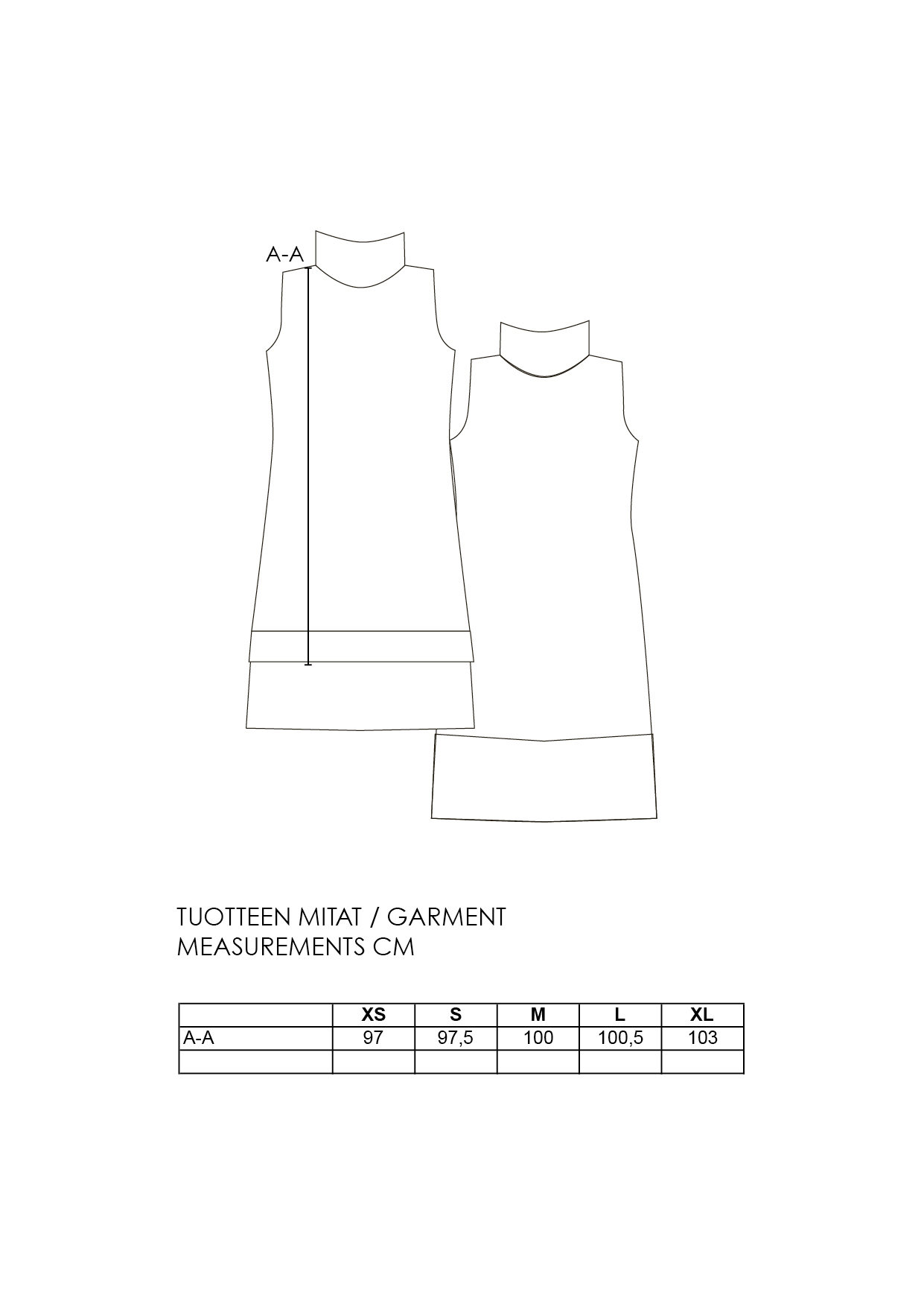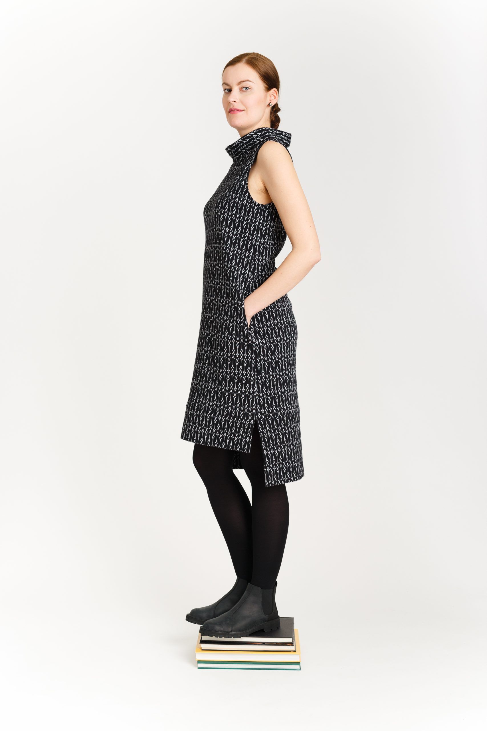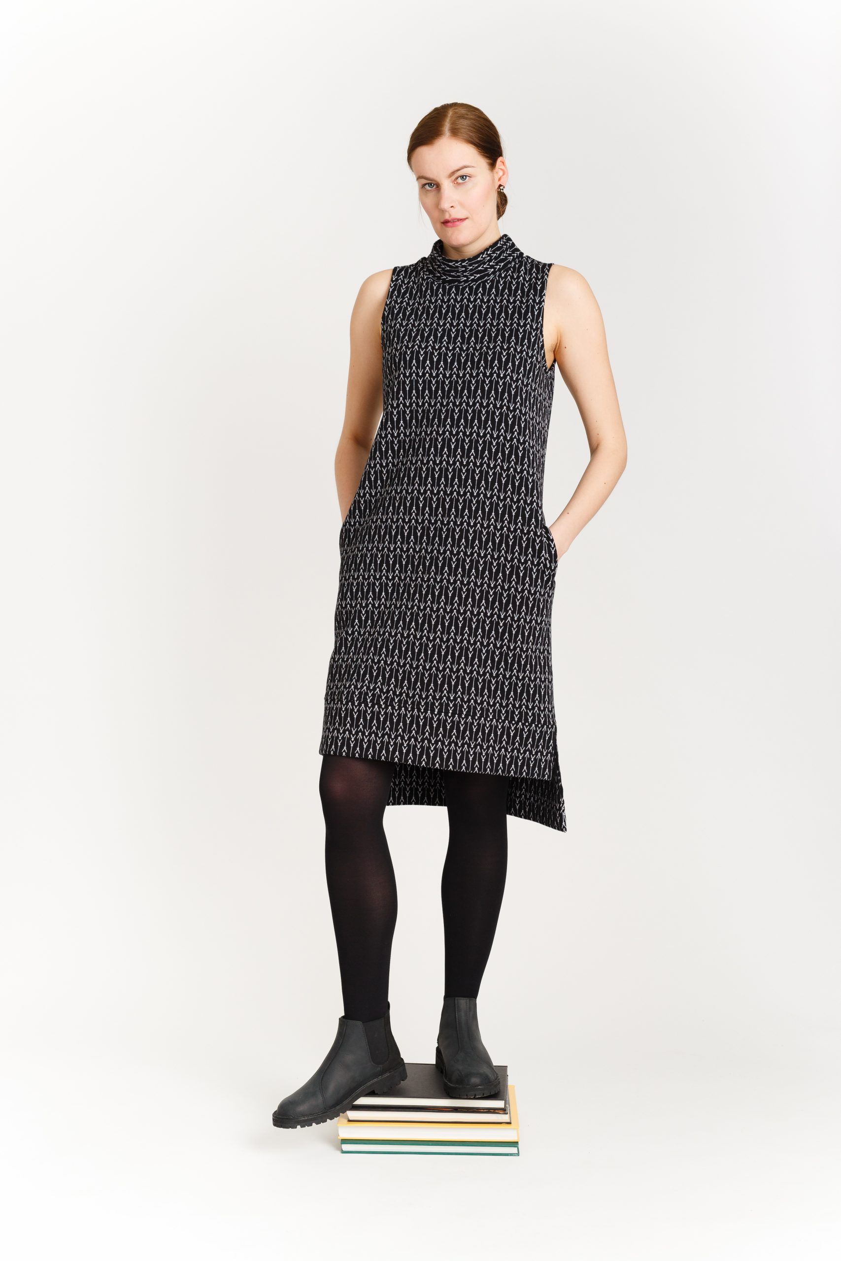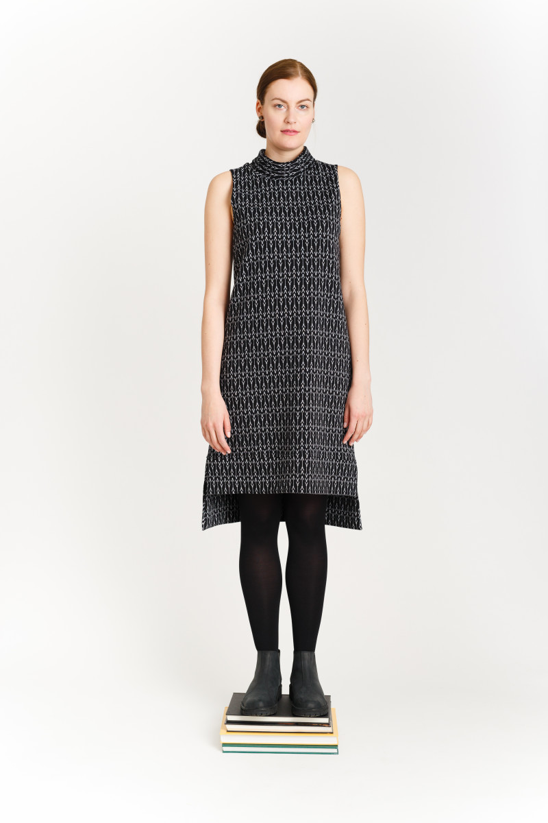 Linjakas ja monikäyttöinen hihaton mekko, joka toimii myös pitkähihaisen trikoopuseron päälle puettuna. Savupiippukaulus, jota voi käyttää suorana tai taittaa kaksinkerroin. Selässä yksityiskohtana kuminauha. Sivusaumataskut lantiolla. Helma takaa pidempi, sivussa pitkä halkio. Materiaalina ylellinen, napakka 100% luomupuuvillaneulos.